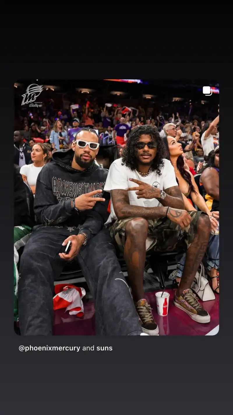 来源:Instagram虎扑09月03日讯 太阳球员杰伦-格林更新ins,晒出与狄龙-布鲁克斯一同观看同城WNBA球队菲尼克斯水星队比赛的合影。